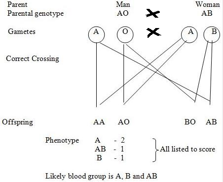 (b) A man whose blood group is heterozygote A is married to a woman whose blood group is AB. With the aid of a genetic diagram, suggest the possible blood group of their children.