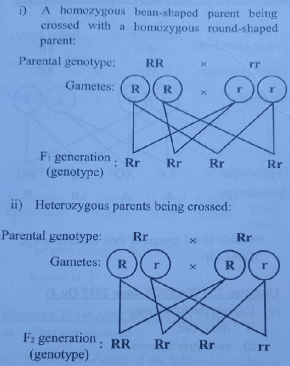 (b) In a mango plant, the allele for bean-shaped seed is r and is recessive to round-shaped seed R. With the aid of a genetic diagram, determine the genotypes of the offspring if: